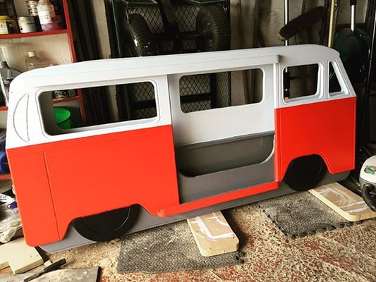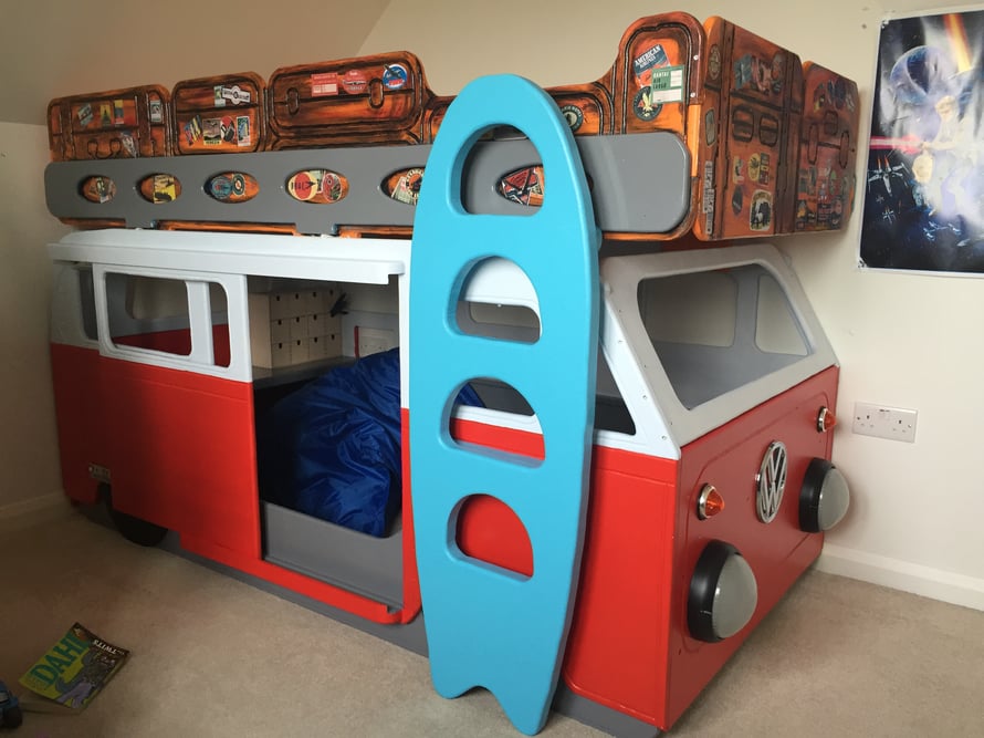 What makes this bed truly special is the sliding side door, just like a real Vee Dub, that adds an extra element of adventure and fun. Inside, the bed is filled with comfortable cushions and soft toys, creating a cozy and inviting space to relax and unwind. Whether your child is a budding adventurer or simply loves the unique design, the Campervan bed is sure to be a hit!