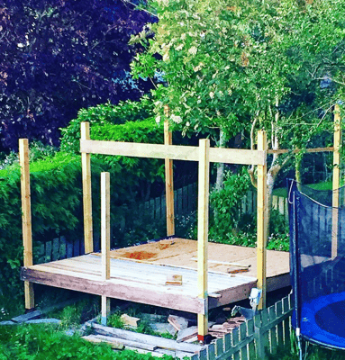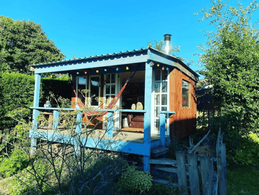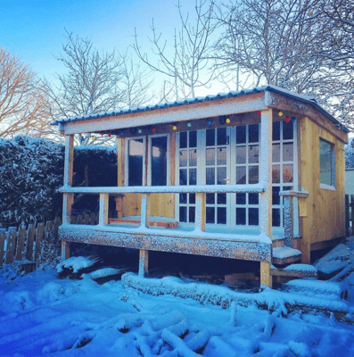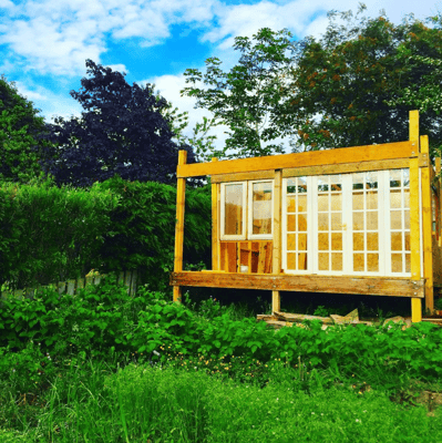 The Megaden is a charming and unique structure in the garden that offers a peaceful and tranquil space for relaxation, entertainment, and work. It stands tall on stilts, 4 meters long and 2.5 meters wide, with a pitched metal roof that provides excellent shelter from the elements. The recycled windows and multipane patio doors give it a rustic and vintage feel that adds to its character.